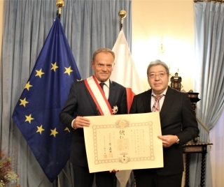 トゥスク前議長は、2014年から2019年までの欧州理事会議長在任中、日EU経済連携協定(EPA) 及び日EU戦略的パートナーシップ協定(SPA) の交渉妥結・署名・発効に尽力するなど、日EU関係の発展と深化に多大な貢献を行いました。こうした日本・EU関係の深化に対する長年の貢献とポーランド首相として日ポーランド間の関係強化への貢献により、前議長は令和3年春の外国人叙勲にて旭日大綬章を受章 しました。